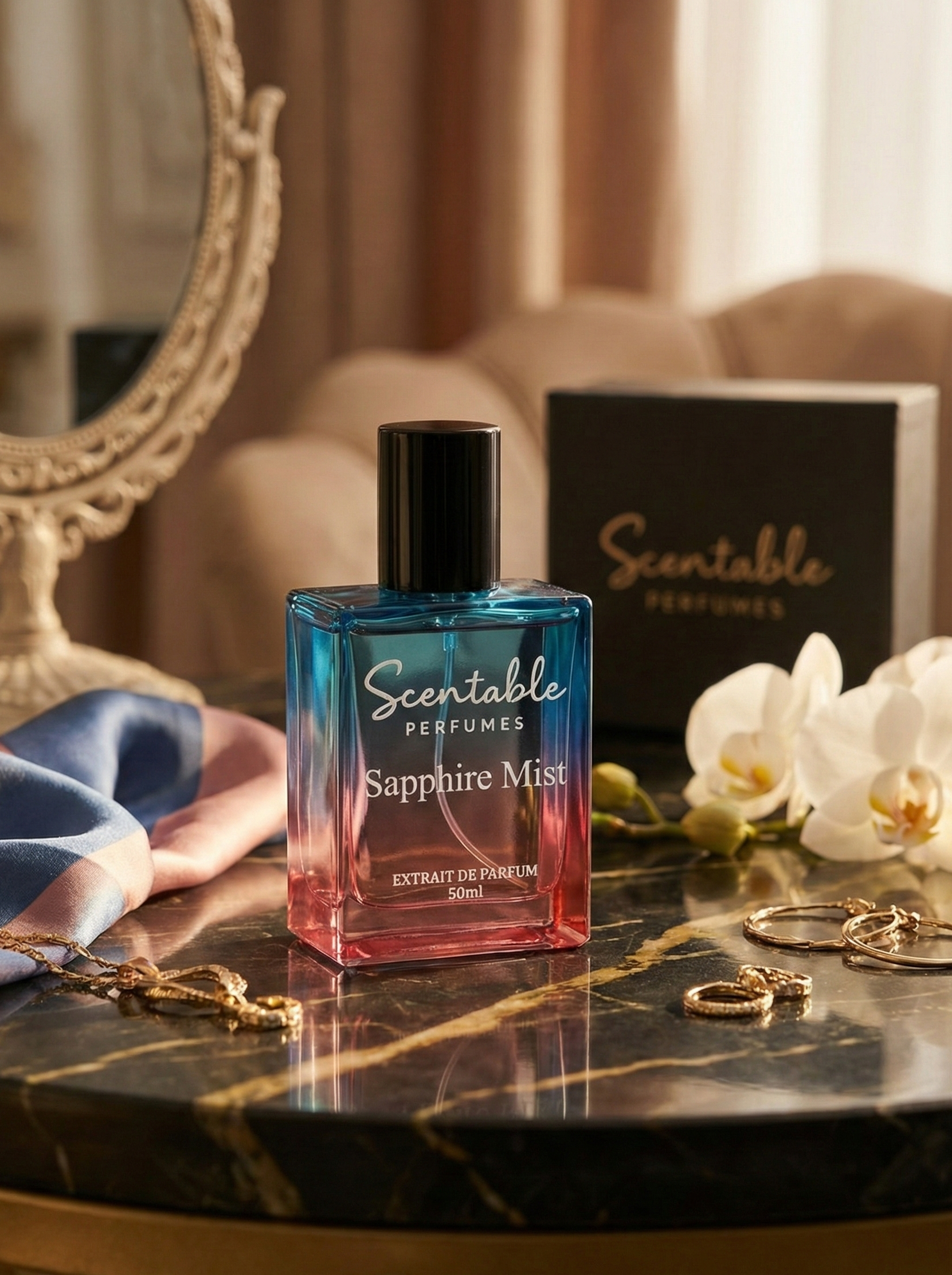 Sapphire Mist Extrait de Parfum 50ml by Scentable Perfumes – A vibrant, enchanting blend of fresh florals, juicy fruits, and warm woods for the modern woman.